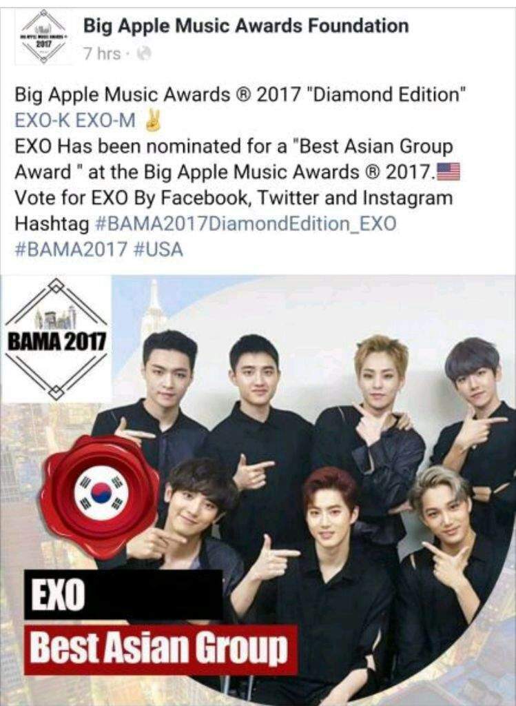 EXO have been nominated for daf BAMA MUSIC AWARDS 2017.