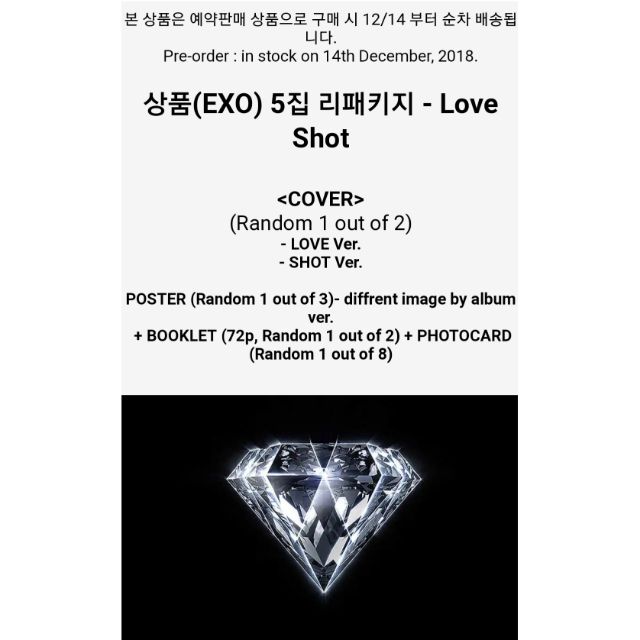 Back order - usually ships in 1-3 weeks If you have preback orders in your basket then all items will be sent together. We use cookies and similar tools that are necessary to enable you to make purchases to enhance your shopping experience and provide our services as detailed in our Cookie NoticeWe also use these cookies to understand how customers use our services for example by measuring site visits so we can make improvements. EXOs the 5th album repackage LOVE SHOT is outListen and download on iTunes Apple Music Spotify and Google Play Music httpsmarturlitEXO_LOVESHOT. Will release on 14th of Dec 2018.